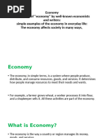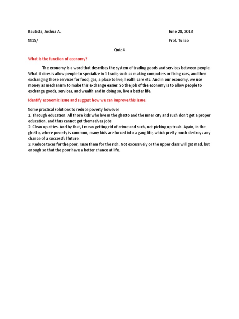 The economy is a word that describes the system of trading goods and services between people. What it does is allow people to specialize in 1 trade, such as making computers or fixing cars, and then exchanging those services for food, gas, a place to live, health care etc. And in our economy, we use money as mechanism to make this exchange easier. So the job of the economy is to allow people to exchange goods, services, and wealth and in doing so, live a better life. Identify economic issue and suggest how we can improve this issue. Some practical solutions to reduce poverty however 1. Through education. All those kids who live in the ghetto and the inner city and such don't get a proper education, and thus cannot get themselves jobs. 2. Clean up cities. And by that, I mean getting rid of crime and such, not picking up trash. Again, in the ghetto, where poverty is common, many kids are forced into a gang life, which pretty much destroys any chance of a successful future. 3. Reduce taxes for the poor, raise them for the rich. Not excessively or the upper class will get mad, but enough so that the poor have a better chance at life.