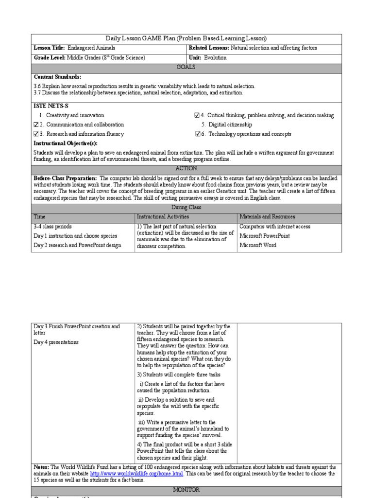 Lesson Title: Endangered Animals Grade Level: Middle Grades (8th Grade cience) Content Standards: #$% E&'lain ho( se&ual re'roduction results in genetic !ariability (hich leads to natural selection$ #$) Discuss the relationshi' bet(een s'eciation* natural selection* ada'tation* and e&tinction$ ISTE NETS-S +$ ,reati!ity and inno!ation /$ ,ommunication and collaboration #$ 2esearch and information fluency Instructional Objective(s): tudents (ill de!elo' a 'lan to sa!e an endangered animal from e&tinction$ 3he 'lan (ill include a (ritten argument for go!ernment funding* an identification list of en!ironmental threats* and a breeding 'rogram outline$ A,34"N e!ore-Class "re#aration: 3he com'uter lab should be signed out for a full (ee. to ensure that any delays5'roblems can be handled (ithout students losing (or. time$ 3he students should already .no( about food chains from 're!ious years* but a re!ie( may be necessary$ 3he teacher (ill co!er the conce't of breeding 'rograms in an earlier Genetics unit$ 3he teacher (ill create a list of fifteen endangered s'ecies that may be researched$ 3he s.ill of (riting 'ersuasi!e essays is co!ered in English class$ During ,lass 3ime #6- class 'eriods Day + instruction and choose s'ecies Day / research and Po(erPoint design 4nstructional Acti!ities +) 3he last 'art of natural selection (e&tinction) (ill be discussed as the rise of mammals (as due to the elimination of dinosaur com'etition$ Materials and 2esources ,om'uters (ith internet access Microsoft Po(erPoint Microsoft 7ord -$ ,ritical thin.ing* 'roblem sol!ing* and decision ma.ing 0$ Digitial citi1enshi' %$ 3echnology o'erations and conce'ts Related Lessons: Natural selection and affecting factors Unit: E!olution G"AL
