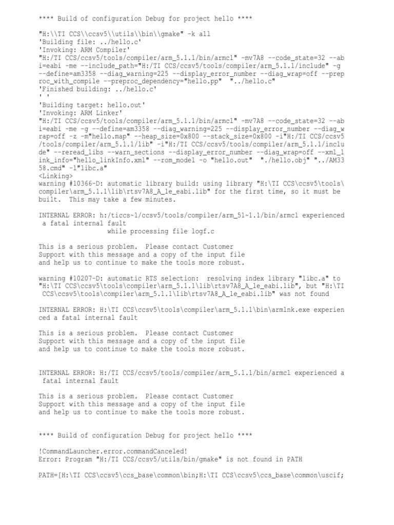 c' 'Invoking: ARM Compiler' "H:/TI CCS/ccsv5/tools/compiler/arm_5.1.1/bin/armcl" -mv7A8 --code_state=32 --ab i=eabi -me --include_path="H:/TI CCS/ccsv5/tools/compiler/arm_5.1.1/include" -g --define=am3358 --diag_warning=225 --display_error_number --diag_wrap=off --prep roc_with_compile --preproc_dependency="hello.pp" "../hello.c" 'Finished building: ../hello.c' ' ' 'Building target: hello.out' 'Invoking: ARM Linker' "H:/TI CCS/ccsv5/tools/compiler/arm_5.1.1/bin/armcl" -mv7A8 --code_state=32 --ab i=eabi -me -g --define=am3358 --diag_warning=225 --display_error_number --diag_w rap=off -z -m"hello.map" --heap_size=0x800 --stack_size=0x800 -i"H:/TI CCS/ccsv5 /tools/compiler/arm_5.1.1/lib" -i"H:/TI CCS/ccsv5/tools/compiler/arm_5.1.1/inclu de" --reread_libs --warn_sections --display_error_number --diag_wrap=off --xml_l ink_info="hello_linkInfo.xml" --rom_model -o "hello.out" "./hello.obj" "../AM33 58.cmd" -l"libc.a" <Linking> warning #10366-D: automatic library build: using library "H:\TI CCS\ccsv5\tools\ compiler\arm_5.1.1\lib\rtsv7A8_A_le_eabi.lib" for the first time, so it must be built. This may take a few minutes. INTERNAL ERROR: h:/ticcs~1/ccsv5/tools/compiler/arm_51~1.1/bin/armcl experienced a fatal internal fault while processing file logf.c This is a serious problem. Please contact Customer Support with this message and a copy of the input file and help us to continue to make the tools more robust. warning #10207-D: automatic RTS selection: resolving index library "libc.a" to "H:\TI CCS\ccsv5\tools\compiler\arm_5.1.1\lib\rtsv7A8_A_le_eabi.lib", but "H:\TI CCS\ccsv5\tools\compiler\arm_5.1.1\lib\rtsv7A8_A_le_eabi.lib" was not found INTERNAL ERROR: H:\TI CCS\ccsv5\tools\compiler\arm_5.1.1\bin\armlnk.exe experien ced a fatal internal fault This is a serious problem. Please contact Customer Support with this message and a copy of the input file and help us to continue to make the tools more robust. INTERNAL ERROR: H:/TI CCS/ccsv5/tools/compiler/arm_5.1.1/bin/armcl experienced a fatal internal fault This is a serious problem. Please contact Customer Support with this message and a copy of the input file and help us to continue to make the tools more robust. **** Build of configuration Debug for project hello **** !CommandLauncher.error.commandCanceled! Error: Program "H:/TI CCS/ccsv5/utils/bin/gmake" is not found in PATH PATH=[H:\TI CCS\ccsv5\ccs_base\common\bin;H:\TI CCS\ccsv5\ccs_base\common\uscif;