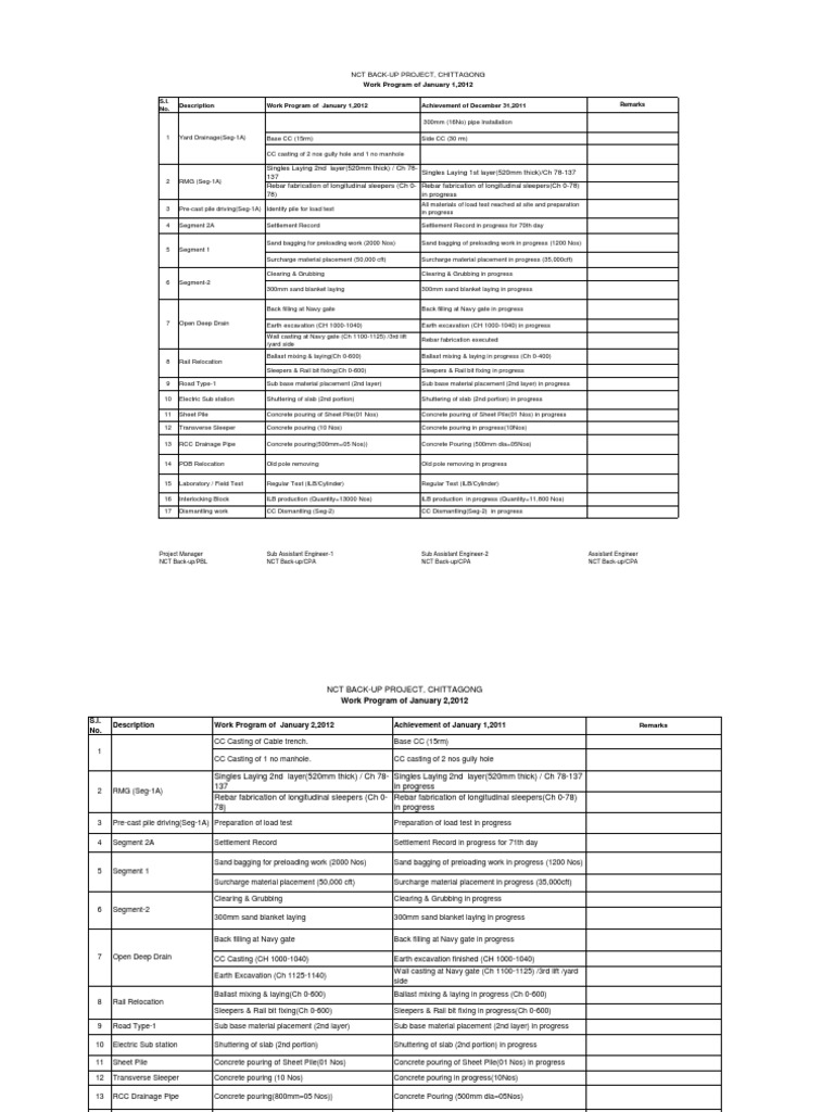 S.l. No. Description Work Program of January 1,2012 Achievement of December 31,2011 300mm (16No) pipe Installation 1 Yard Drainage(Seg-1A) Base CC (15rm) CC casting of 2 nos gully hole and 1 no manhole Side CC (30 rm)