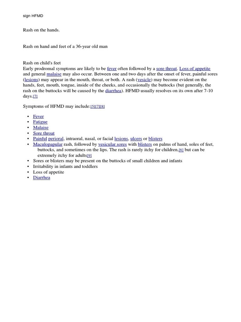 Rash on child's feet Early prodromal symptoms are likely to be fever often followed by a sore throat. Loss of appetite and general malaise may also occur. Between one and two days after the onset of fever, painful sores (lesions) may appear in the mouth, throat, or both. A rash (vesicle) may become evident on the hands, feet, mouth, tongue, inside of the cheeks, and occasionally the buttocks (but generally, the rash on the buttocks will be caused by the diarrhea). HFMD usually resolves on its own after 7-10 days.[7] Symptoms of HFMD may include:[5][7][8] Fever Fatigue Malaise Sore throat Painful perioral, intraoral, nasal, or facial lesions, ulcers or blisters Maculopapular rash, followed by vesicular sores with blisters on palms of hand, soles of feet, buttocks, and sometimes on the lips. The rash is rarely itchy for children,[6] but can be extremely itchy for adults[9] Sores or blisters may be present on the buttocks of small children and infants Irritability in infants and toddlers Loss of appetite Diarrhea