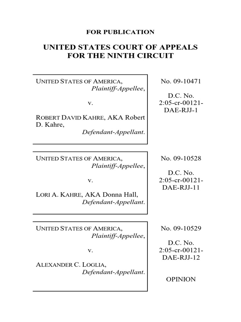 Michael K. Powell and Michael J. Kennedy (argued), Assistant Federal Public Defenders, Reno, Nevada, for Appellant Lori A. Kahre. Lisa A. Rasmussen, Las Vegas, Nevada, for Appellant Robert D. Kahre. Joel F. Hansen, Hansen Rasmussen, Las Vegas, Nevada, for Appellant Alexander C. Loglia. Gregory Victor Davis, Mark S. Determan (argued), Department of Justice, Washington, D.C., for Appellee United States.