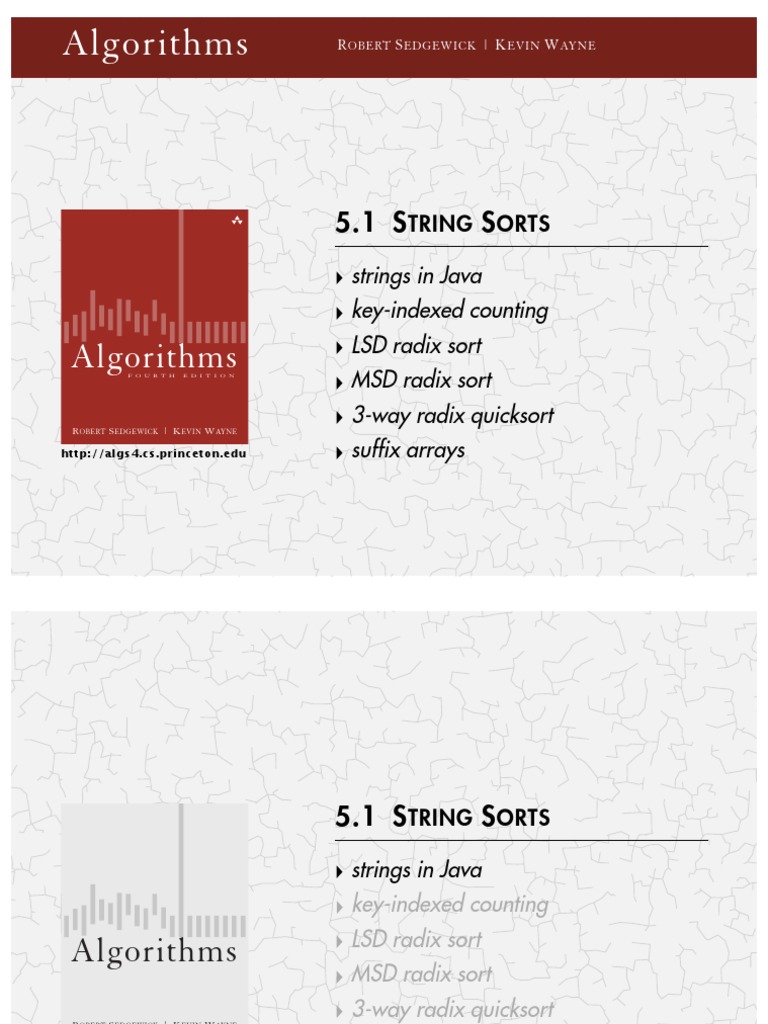 ! LSD radix sort ! MSD radix sort ! 3-way radix quicksort ! suffix arrays