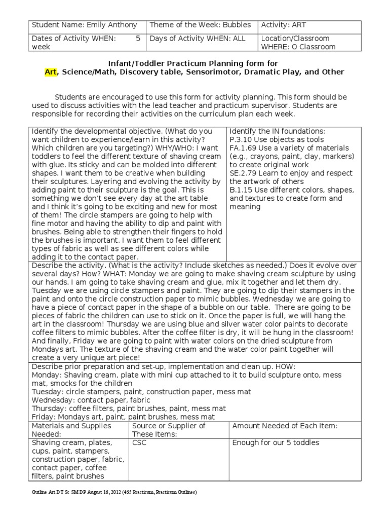 Infant/Toddler Practicum Planning form for Art, Science/Math, Discovery table, Sensorimotor, Dramatic Play, and Other Activities Students a$e encou$a&ed to use this fo$m fo$ activity 'lannin&( This fo$m should be used to discuss activities ith the lead teache$ and '$acticum su'e$viso$( Students a$e $es'onsible fo$ $eco$din& thei$ activities on the cu$$iculum 'lan each eek( )dentify the develo'mental ob*ective( +What do you )dentify the )N foundations: ant child$en to e,'e$ience"lea$n in this activity2(3(45 6se ob*ects as tools Which child$en a$e you ta$&etin&-. WH/"WH%: ) ant 7A(4(89 6se a va$iety of mate$ials toddle$s to feel the diffe$ent te,tu$e of shavin& c$eam +e(&(: c$ayons: 'aint: clay: ma$ke$s. ith &lue( )ts sticky and can be molded into diffe$ent to c$eate o$i&inal o$k sha'es( ) ant them to be c$eative hen buildin& SE(;(<9 !ea$n to en*oy and $es'ect thei$ scul'tu$es( !aye$in& and evolvin& the activity by the a$t o$k of othe$s addin& 'aint to thei$ scul'tu$e is the &oal( This is B(4(45 6se diffe$ent colo$s: sha'es: somethin& e don0t see eve$y day at the a$t table and te,tu$es to c$eate fo$m and and ) think it0s &oin& to be e,citin& and ne fo$ most meanin& of them1 The ci$cle stam'e$s a$e &oin& to hel' ith fine moto$ and havin& the ability to di' and 'aint ith b$ushes( Bein& able to st$en&then thei$ fin&e$s to hold the b$ushes is im'o$tant( ) ant them to feel diffe$ent ty'es of fab$ic as ell as see diffe$ent colo$s hile addin& it to the contact 'a'e$( Desc$ibe the activity( +What is the activity- )nclude sketches as needed(. Does it evolve ove$ seve$al days- Ho - WHAT: =onday e a$e &oin& to make shavin& c$eam scul'tu$e by usin& ou$ hands( ) am &oin& to take shavin& c$eam and &lue: mi, it toðe$ and let them d$y( Tuesday e a$e usin& ci$cle stam'e$s and 'aint( They a$e &oin& to di' thei$ stam'e$s in the 'aint and onto the ci$cle const$uction 'a'e$ to mimic bubbles( Wednesday e a$e &oin& to have a 'iece of contact 'a'e$ in the sha'e of a bubble on ou$ table( The$e a$e &oin& to be 'ieces of fab$ic the child$en can use to stick on it( %nce the 'a'e$ is full: e ill han& the a$t in the class$oom1 Thu$sday e a$e usin& blue and silve$ ate$ colo$ 'aints to deco$ate coffee filte$s to mimic bubbles( Afte$ the coffee filte$ is d$y: it ill be hun& in the class$oom1 And finally: 7$iday e a$e &oin& to 'aint ith ate$ colo$s on the d$ied scul'tu$e f$om =ondays a$t( The te,tu$e of the shavin& c$eam and the ate$ colo$ 'aint toðe$ ill c$eate a ve$y uni>ue a$t 'iece1 Desc$ibe '$io$ '$e'a$ation and set?u': im'lementation and clean u'( H%W: =onday: Shavin& c$eam: 'late ith mini cu' attached to it to build scul'tu$e onto: mess mat: smocks fo$ the child$en Tuesday: ci$cle stam'e$s: 'aint: const$uction 'a'e$: mess mat Wednesday: contact 'a'e$: fab$ic Thu$sday: coffee filte$s: 'aint b$ushes: 'aint: mess mat 7$iday: =ondays a$t: 'aint: 'aint b$ushes: mess mat =ate$ials and Su''lies Sou$ce o$ Su''lie$ of Amount Needed of Each )tem: Needed: These )tems: Shavin& c$eam: 'lates: #S# Enou&h fo$ ou$ 5 toddles cu's: 'aint: stam'e$s: const$uction 'a'e$: fab$ic: contact 'a'e$: coffee filte$s: 'aint b$ushes