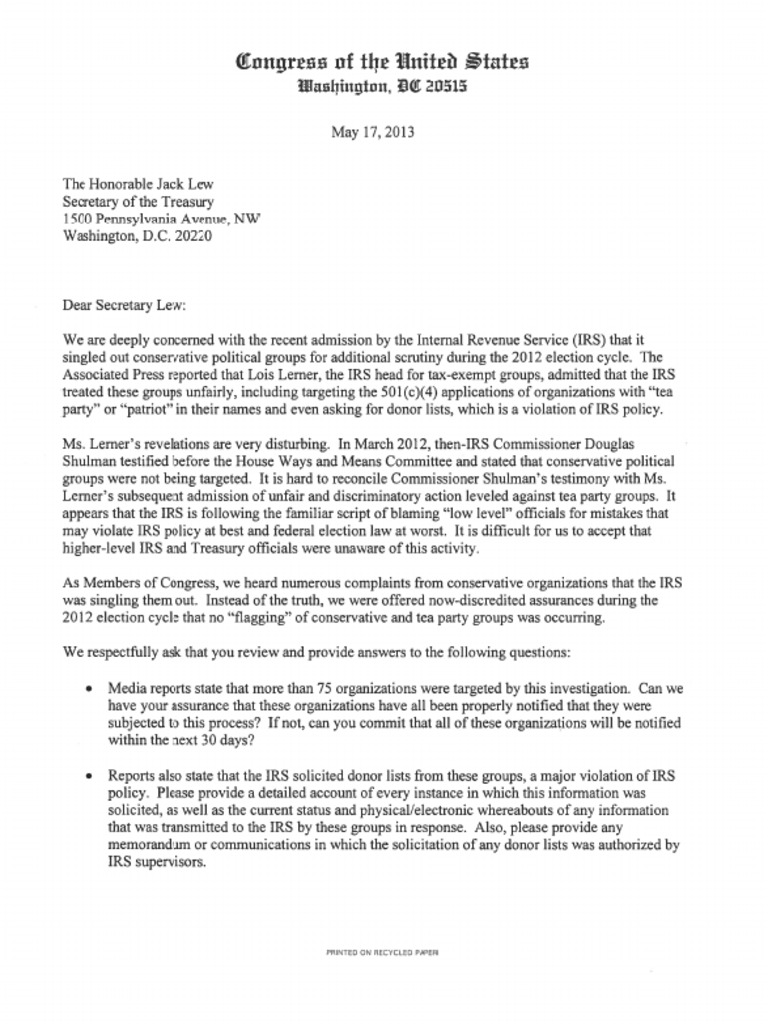May 16, 2013: Rep. Culberson signed on to a letter to Treasury Secretary Jack Lew demanding answers on allegations that the IRS flagged Tea Party groups for audit based on political beliefs.