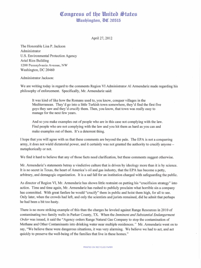 April 27, 2012: Rep. Culberson joined 27 members of Congress on a letter calling for the immediate termination of EPA Region VI Administrator Al Armendariz in response to his philosophy of e…Full description