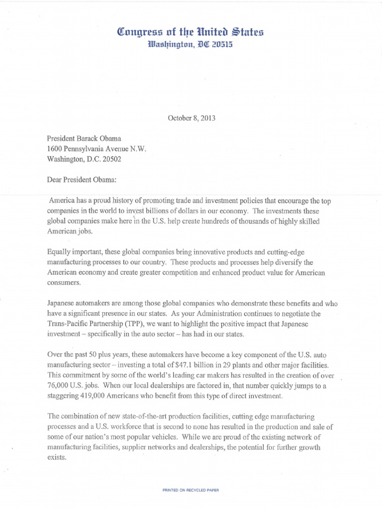 Letter to President Obama Encouraging Trade with Japan