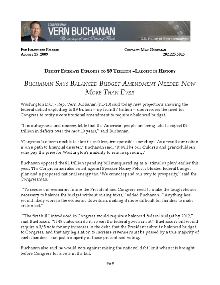 Rep. Vern Buchanan (FL-13) said today new projections showing the federal deficit exploding to $9 trillion -- up from $7 trillion -- underscores the need for Congress to ratify a constitutional amendment to require a balanced budget.