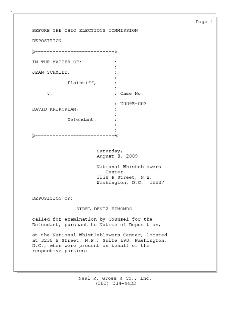 Saturday, August 8, 2009 National Whisteblowers Center 3238 P Street, N.W. Washington, D.C. 20007DEPOSITION OF: SIBEL DENIZ EDMONDScalled for examination by Counsel for theDefendant, pursuant to Notice of Deposition,at the National Whistleblowers Center, locatedat 3238 P Street, N.W., Suite 690, Washington,D.C., when were present on behalf of therespective parties: