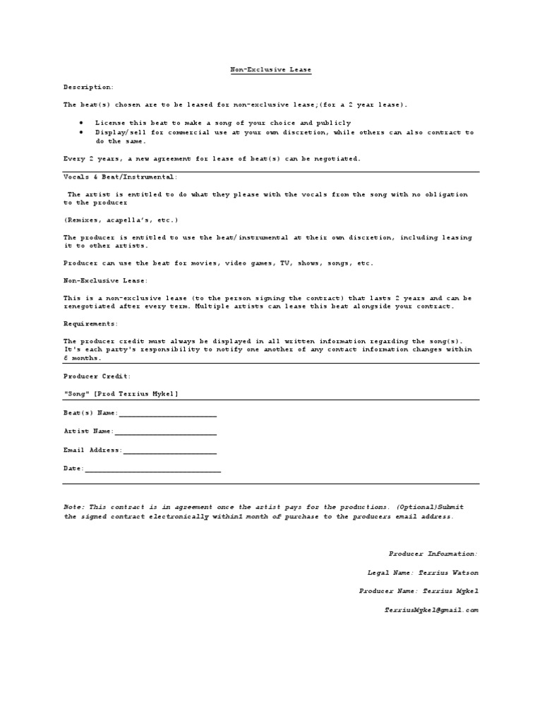 Every 2 years, a new agreement for lease of beat(s) can be negotiated. Vocals & Beat/Instrumental: The artist is entitled to do what they please with the vocals from the song with no obligation to the producer (Remixes, acapellas, etc.) The producer is entitled to use the beat/instrumental at their own discretion, including leasing it to other artists. Producer can use the beat for movies, video games, TV, shows, songs, etc. Non-Exclusive Lease: This is a non-exclusive lease (to the person signing the contract) that lasts 2 years and can be renegotiated after every term. Multiple artists can lease this beat alongside your contract. Requirements: The producer credit must always be displayed in all written information regarding the song(s). It's each party's responsibility to notify one another of any contact information changes within 6 months. Producer Credit: "Song" [Prod Terrius Mykel] Beat(s) Name:_______________________ Artist Name:________________________ Email Address:______________________ Date:________________________________