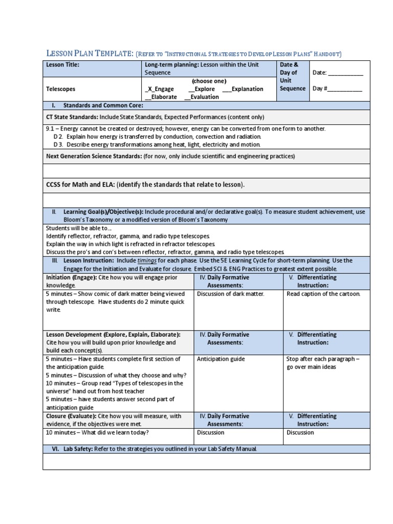 Learning Goal(s)/Objective(s): Include procedural and/or declarative goal(s). To measure student achievement, use Blooms Taxonomy or a modified version of Blooms Taxonomy Students will be able to Identify reflector, refractor, gamma, and radio type telescopes. Explain the way in which light is refracted in refractor telescopes. Discuss the pros and cons between reflector, refractor, gamma, and radio type telescopes. III. Lesson Instruction: Include timings for each phase. Use the 5E Learning Cycle for short-term planning. Use the Engage for the Initiation and Evaluate for closure. Embed SCI & ENG Practices to greatest extent possible. Initiation (Engage): Cite how you will engage prior IV. Daily Formative V. Differentiating knowledge. Assessments: Instruction: 5 minutes Show comic of dark matter being viewed Discussion of dark matter. Read caption of the cartoon. through telescope. Have students do 2 minute quick write.