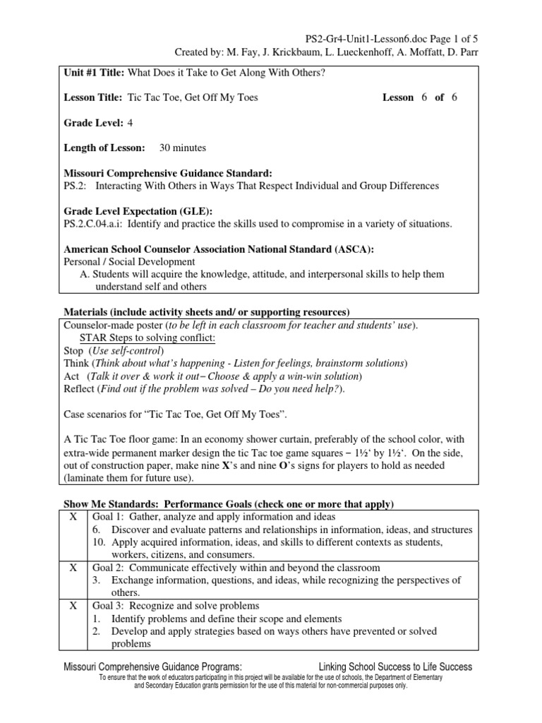 Missouri Comprehensive Guidance Standard: PS.2: Interacting With Others in Ways That Respect Individual and Group Differences Grade Level Expectation (GLE): PS.2.C.04.a.i: Identify and practice the skills used to compromise in a variety of situations. American School Counselor Association National Standard (ASCA): Personal / Social Development A. Students will acquire the knowledge, attitude, and interpersonal skills to help them understand self and others Materials (include activity sheets and/ or supporting resources) Counselor-made poster (to be left in each classroom for teacher and students use). STAR Steps to solving conflict: Stop (Use self-control) Think (Think about whats happening - Listen for feelings, brainstorm solutions) Act (Talk it over & work it out Choose & apply a win-win solution) Reflect (Find out if the problem was solved Do you need help?). Case scenarios for Tic Tac Toe, Get Off My Toes. A Tic Tac Toe floor game: In an economy shower curtain, preferably of the school color, with extra-wide permanent marker design the tic Tac toe game squares 1 by 1. On the side, out of construction paper, make nine Xs and nine Os signs for players to hold as needed (laminate them for future use). Show Me Standards: Performance Goals (check one or more that apply) X Goal 1: Gather, analyze and apply information and ideas 6. Discover and evaluate patterns and relationships in information, ideas, and structures 10. Apply acquired information, ideas, and skills to different contexts as students, workers, citizens, and consumers. X Goal 2: Communicate effectively within and beyond the classroom 3. Exchange information, questions, and ideas, while recognizing the perspectives of others. X Goal 3: Recognize and solve problems 1. Identify problems and define their scope and elements 2. Develop and apply strategies based on ways others have prevented or solved problems Missouri Comprehensive Guidance Programs: