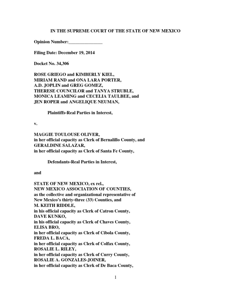 IN THE SUPREME COURT OF THE STATE OF NEW MEXICOOpinion Number:_______________Filing Date: December 19, 2014Docket No. 34,306ROSE GRIEGO and KIMBERLY KIEL,MIRIAM RAND and ONA LARA PORTER,A.D. JOPLIN and GREG GOMEZ,THERESE COUNCILOR and TANYA STRUBLE,MONICA LEAMING and CECELIA TAULBEE, andJEN ROPER and ANGELIQUE NEUMAN,Plaintiffs-Real Parties in Interest,v.MAGGIE TOULOUSE OLIVER,in her official capacity as Clerk of Bernalillo County, andGERALDINE SALAZAR,in her official capacity as Clerk of Santa Fe County,Defendants-Real Parties in Interest,andSTATE OF NEW MEXICO, ex rel., NEW MEXICO ASSOCIATION OF COUNTIES,as the collective and organizational representative of New Mexico’s thirty-three (33) Counties, andM. KEITH RIDDLE,in his official capacity as Clerk of Catron County,DAVE KUNKO,in his official capacity as Clerk of Chaves County,ELISA BRO,in her official capacity as Clerk of Cibola County,FREDA L. BACA,in her official capacity as Clerk of Colfax County,ROSALIE L. RILEY,in her official capacity as Clerk of Curry County,ROSALIE A. GONZALES-JOINER,in her official capacity as Clerk of De Baca County,