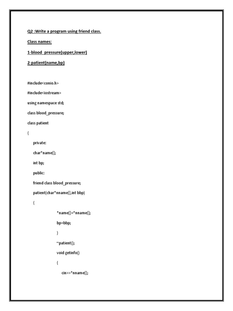 #include<conio.h> #include<iostream> using namespace std; class blood_pressure; class patient { private: char*name[]; int bp; public: friend class blood_pressure; patient(char*nname[],int bbp) { *name[]=*nname[]; bp=bbp; } ~patient(); void getinfo() { cin>>*nname[];