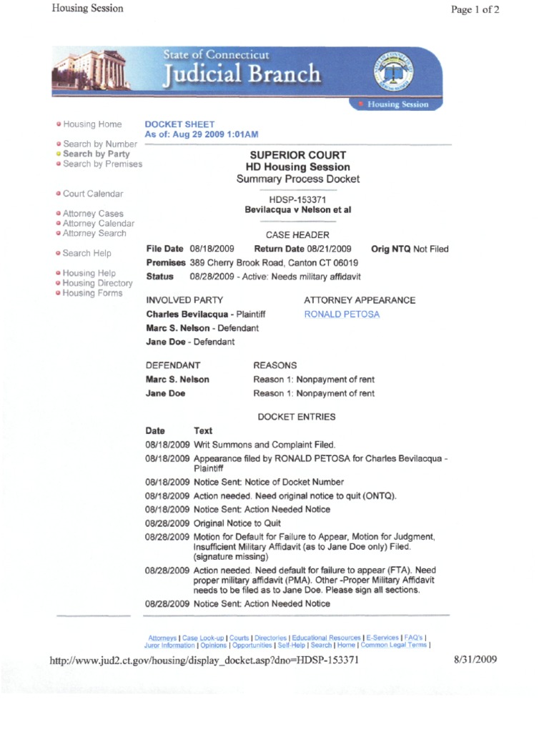 DOCKET SHEET As of:aug 29 2009 1:01 AM SUPERIOR COURT HD Housing Session Summary Process Docket HDSP-153371 Bevilacqua v. Nelson et al DOCKET ENTRIES Date Text 08 / 18 / 2009 Writ Summons and Complaint Filed Premises 389 Cherry Brook road, Canton CT 06019 REASONS Reason 1: Nonpayment of rent.
