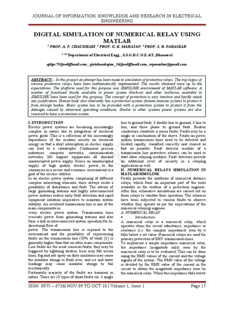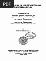 ABSTRACT: - In this project an attempt has been made to simulation of protective relays. The trip logics of various protective relays have been mathematically implemented. The results obtained were up to the expectations. The platform used for this purpose was SIMU I!" environment of M#T #$ software. # number of functional bloc%s available in power system bloc%-set and other toolboxes available in SIMU I!" have been used for this purpose. The concept of protection is very intuitive and hardly needs any justification. &uman body also inherently has a protection system 'human immune system( to protect it from foreign bodies. )very system has to be provided with a protection system to protect it from the damages caused by abnormal operating conditions. Similar to other systems power systems are also re*uired to have a protection system. I! INTRODUCTION Electric power ! te" #re $eco"i%& i%cre# i%&l! co"ple' i% %#t(re )(e to i%te&r#tio% o* electric#l power &ri) . T+i i # re*lectio% o* t+e i%cre# i%&l! )epe%)e%ce o* t+e "o)er% ociet! o% electric#l e%er&! o t+#t # +ort i%terr(ptio% i% electric (ppl! c#% le#) to # c#t# trop+e. Co%ti%(o( proce i%)( trie , co"p(ter %etwor, , co""(%ic#tio% %etwor, , li*e (pport e-(ip"e%t #ll )e"#%) (%i%terr(pte) power (ppl!. He%ce #% (%i%terr(pte) (ppl! o* +i&+ -(#lit! electric power to t+e co% ("er i% # ec(re #%) eco%o"ic e%.iro%"e%t i # &o#l o* t+e electric (tilitie . I% #% electric power ! te" co"pri i%& o* )i**ere%t co"ple' i%ter#cti%& ele"e%t , t+ere #lw#! e'i t # po i$ilit! o* )i t(r$#%ce #%) *#(lt. T+e #).e%t o* l#r&e &e%er#ti%& t#tio% #%) +i&+l! i%terco%%ecte) power ! te" "#,e e#rl! *#(lt )etectio% #%) r#pi) e-(ip"e%t i ol#tio% i"per#ti.e to "#i%t#i% ! te" t#$ilit!. A% o.er+e#) tr#% "i io% li%e i o%e o* t+e "#i% co"po%e%t i% e.er! electric power ! te". Tr#% "i io% li%e e.#c(#te power *ro" &e%er#ti%& t#tio% #%) #l o *or" # li%, i% i%terco%%ecte) ! te" oper#tio% *or $i/ )irectio%#l *low o* power. T+e tr#% "i io% li%e i e'po e) to t+e e%.iro%"e%t #%) t+e po i$ilit! o* e'perie%ci%& *#(lt o% t+e tr#% "i io% li%e 0123 o* tot#l4 567 i &e%er#ll! +i&+er t+#% t+#t o% ot+er "#i% co"po%e%t . Li%e *#(lt #re t+e "o t co""o% *#(lt , t+e! "#! $e tri&&ere) $! li&+t%i%& tro,e , tree "#! *#ll #cro li%e , *o& #%) #lt pr#! o% )irt! i% (l#tor "#! c#( e t+e i% (l#tor tri%& to *l# + o.er, #%) ice #%) %ow lo#)i%& "#! c#( e i% (l#tor tri%& to *#il "ec+#%ic#ll! Fort(%#tel! "#8orit! o* t+e *#(lt #re tr#% ie%t i% %#t(re. T+ere #re 62 t!pe o* +(%t *#(lt .i9. : i%&le li%e to &ro(%) *#(lt, : )o($le li%e to &ro(%), : li%e to li%e, #%) t+ree p+# e to &ro(%) *#(lt. ;ro,e% co%)(ctor co% tit(te # erie *#(lt . F#(lt "#! $e # i%&le or co"$i%#tio% o* t+e #$o.e. F#(lt o% power ! te" tr#% "i io% li%e %ee) to $e )etecte) #%) loc#te) r#pi)l!, cl# i*ie) correctl! #%) cle#re) # *# t # po i$le. F#(lt )etector "o)(le o* # tr#% "i io% li%e protecti.e c+e"e c#% $e ( e) to t#rt ot+er rel#!i%& "o)(le . F#(lt )etector pro.i)e #% #))itio%#l le.el o* ec(rit! i% # rel#!i%& #pplic#tio% # well. II! NUMERICAL RELAYS SIMULATION IN MATLAB'SIMULIN( Fir tl! pre e%t t+e !%t+e i o* %("eric#l )i t#%ce rel#! , w+ic+ *or" #% i"port#%t p#rt o* t+e tool #.#il#$le i% t+e tool$o' o* # protectio% e%&i%eer. A*ter t+i , e'+#( ti.e i"(l#tio% #re c#rrie) o(t o% t+e e rel#! to .#li)#te t+eir oper#tio%. T+e c+e"e +#.e $ee% ($8ecte) to .#rio( *#(lt to o$ er.e w+et+er t+e! oper#te # per t+e e'pect#tio% o* t+e %("eric#l rel#!i%& e%&i%eer. #. !UM)+I,# +) # Introduction A %("eric#l rel#! i # %("eric#l rel#!, w+ic+ oper#te w+e% t+e circ(it #)"itt#%ce, i"pe)#%ce or re#ct#%ce 0i.e. t+e co"ple' i"pe)#%ce4 ee% $! it *#ll $elow # et .#l(e. N("eric#l rel#! #re ( e) *or pri"#r! protectio% o* EH< tr#% "i io% li%e . To i"ple"e%t # i"ple i"pe)#%ce %("eric#l rel#!, t+e i"pe)#%ce 0"#&%it()e o%l!4 ee% $! t+e %("eric#l rel#! i to $e e.#l(#te). T+i c#% $e )o%e ( i%& t+e RMS .#l(e o* t+e c(rre%t #%) t+e .olt#&e i&%#l o* t+e ! te". T+e RMS .#l(e o* t+e .olt#&e i )i.i)e) $! t+e RMS .#l(e o* t+e c(rre%t i% t+e circ(it to o$t#i% t+e "#&%it()e i"pe)#%ce ee% $! t+e %("eric#l rel#!. W+e% t+i i"pe)#%ce *#ll $elow