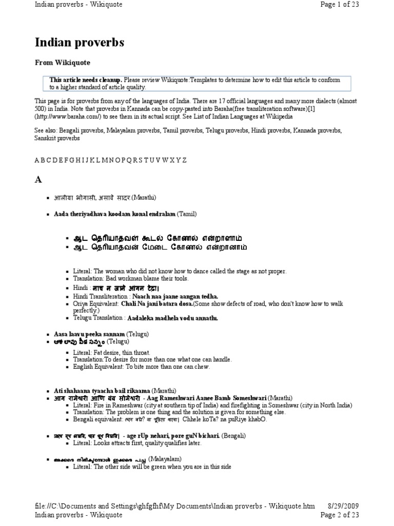 The document provides a collection of proverbs from various Indian languages with translations and equivalents in other languages. It begins with proverbs from Indian languages that start with the letter A, including proverbs in Marathi, Tamil, Telugu, Hindi, Kannada, Sanskrit, Bengali, Malayalam and others. The proverbs cover various topics and provide insights into Indian culture and wisdom.