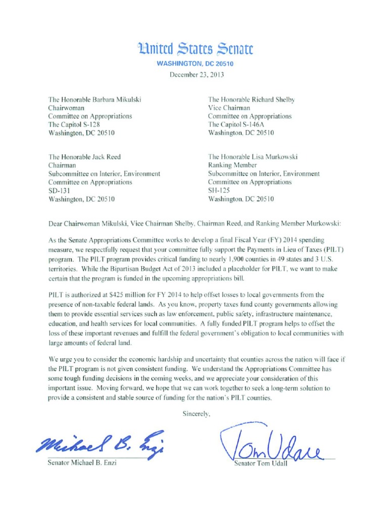 U.S. Senators Tom Udall (D-N.M.) and Mike Enzi (R-Wyo.) sent a letter to the chairs and ranking members of the Senate Appropriations Committee, and Interior subcommittee calling on them to fully support and fund the PILT program.