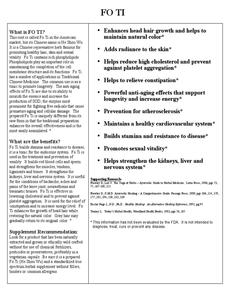 Look for a product that has been naturally extracted and grown or ethically wild crafted without the use of chemical fertilizers, pesticides or preservatives; preferably in a vegetarian capsule. Be sure it is a prepared Fo Ti (He Shou Wu) and a standardized true spectrum herbal supplement without fillers, binders or common allergens.