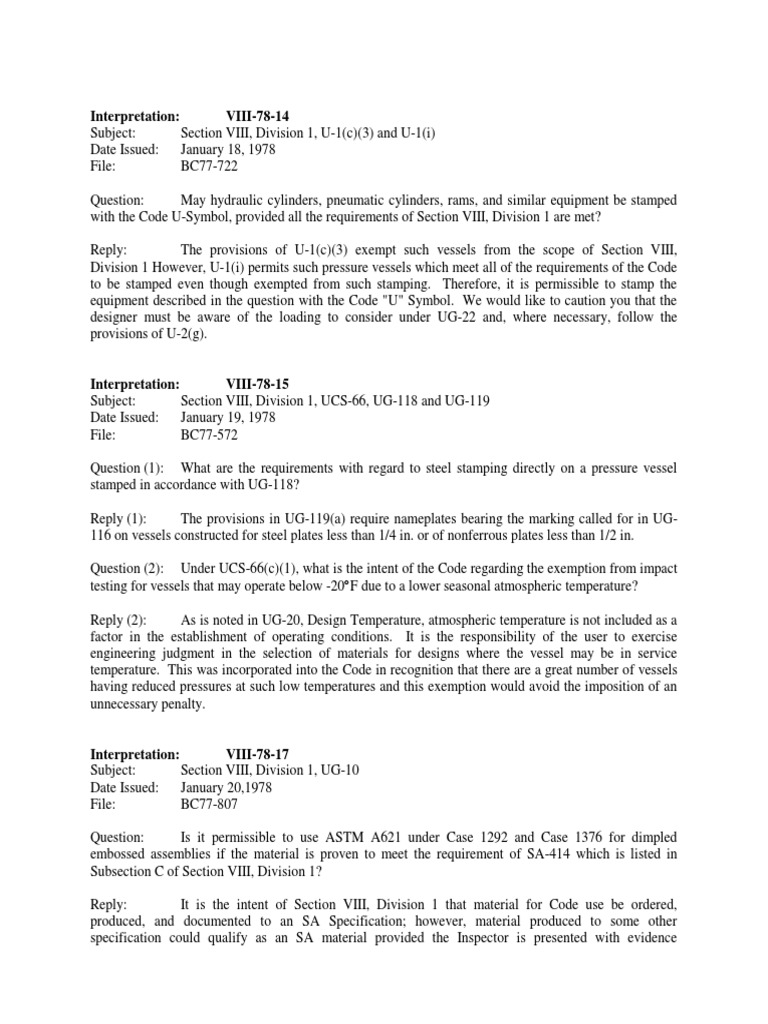 Interpretation: VIII-78-17 Subject: Section VIII, Division 1, UG-10 Date Issued: January 20,1978 File: BC77-807 Question: Is it permissible to use ASTM A621 under Case 1292 and Case 1376 for dimpled embossed assemblies if the material is proven to meet the requirement of SA-414 which is listed in Subsection C of Section VIII, Division 1? Reply: It is the intent of Section VIII, Division 1 that material for Code use be ordered, produced, and documented to an SA Specification; however, material produced to some other specification could qualify as an SA material provided the Inspector is presented with evidence