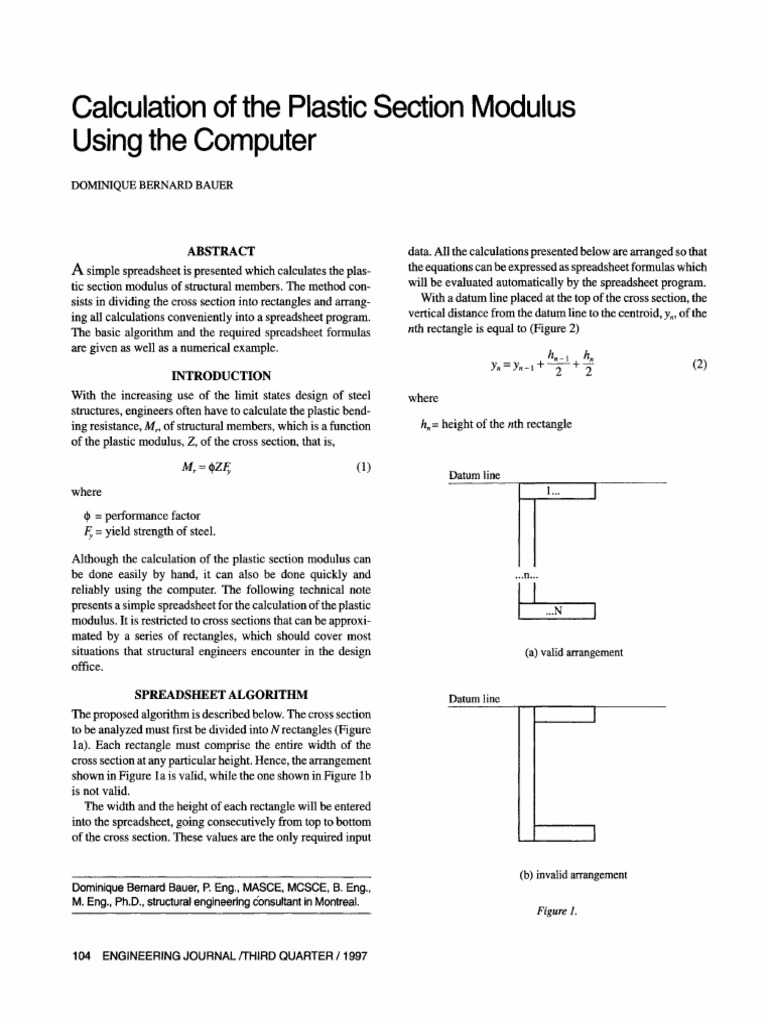 SPREADSHEET FORMULAS The spreadsheet formulas required for the calculation of the plastic section modulus correspond to Equations 2 to 13 given above. There must be as many sets of formulas, arranged in rows in the spreadsheet, as there are rectangles into which the cross section is divided. Assuming that the cross section to be analyzed is composed of 3 rectangles (see the example below), there would be 3 sets of formulas, arranged in 3 rows, say rows 9 to 11 in the spreadsheet. The formulas for the first rectangle, in row 9, would be as shown in Table 1. Note that the syntax used with the formulas given in Table 1 is that of Microsoft Excel. The formulas can be easily