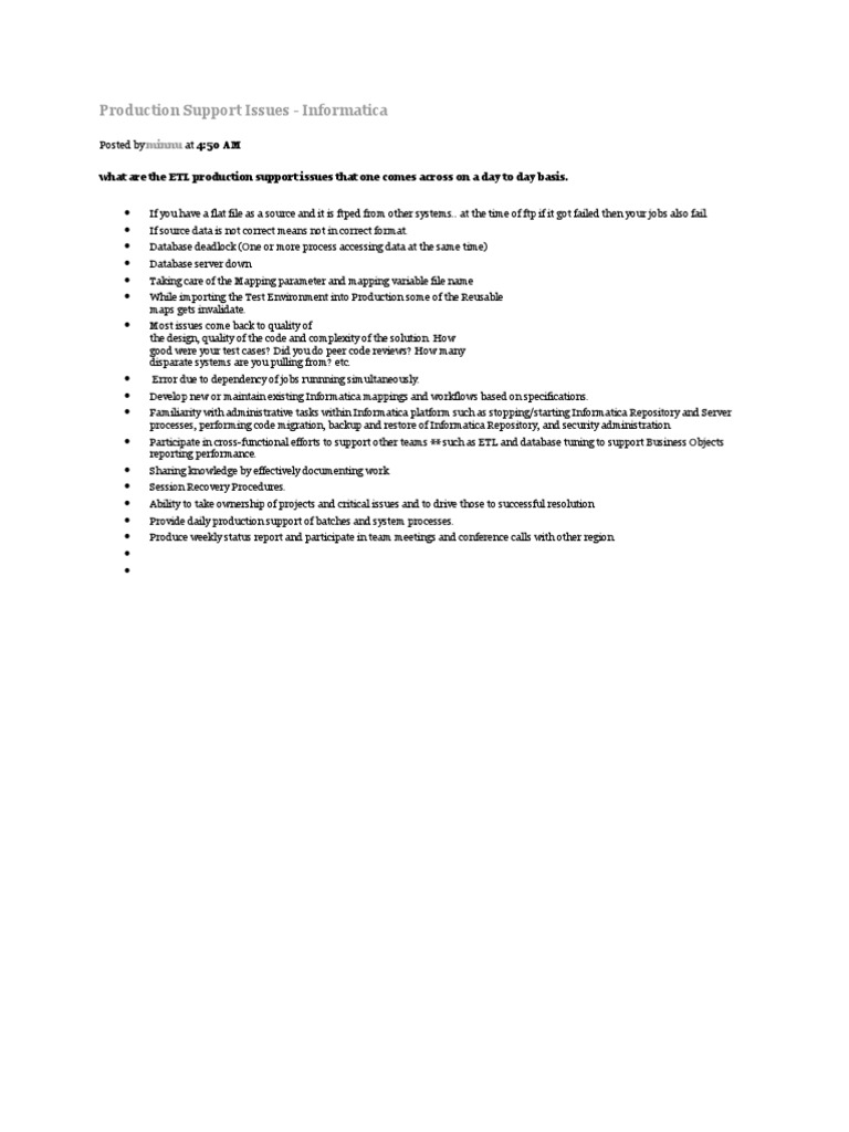 If you have a flat file as a source and it is ftped from other systems.. at the time of ftp if it got failed then your jobs also fail. If source data is not correct means not in correct format. Database deadlock (One or more process accessing data at the same time) Database server down Taking care of the Mapping parameter and mapping variable file name While importing the Test Environment into Production some of the Reusable maps gets invalidate. Most issues come back to quality of the design, quality of the code and complexity of the solution. How good were your test cases? Did you do peer code reviews? How many disparate systems are you pulling from? etc. Error due to dependency of jobs runnning simultaneously. Develop new or maintain existing Informatica mappings and workflows based on specifications. Familiarity with administrative tasks within Informatica platform such as stopping/starting Informatica Repository and Server processes, performing code migration, backup and restore of Informatica Repository, and security administration. Participate in cross-functional efforts to support other teams ** such as ETL and database tuning to support Business Objects reporting performance. Sharing knowledge by effectively documenting work. Session Recovery Procedures. Ability to take ownership of projects and critical issues and to drive those to successful resolution Provide daily production support of batches and system processes. Produce weekly status report and participate in team meetings and conference calls with other region.