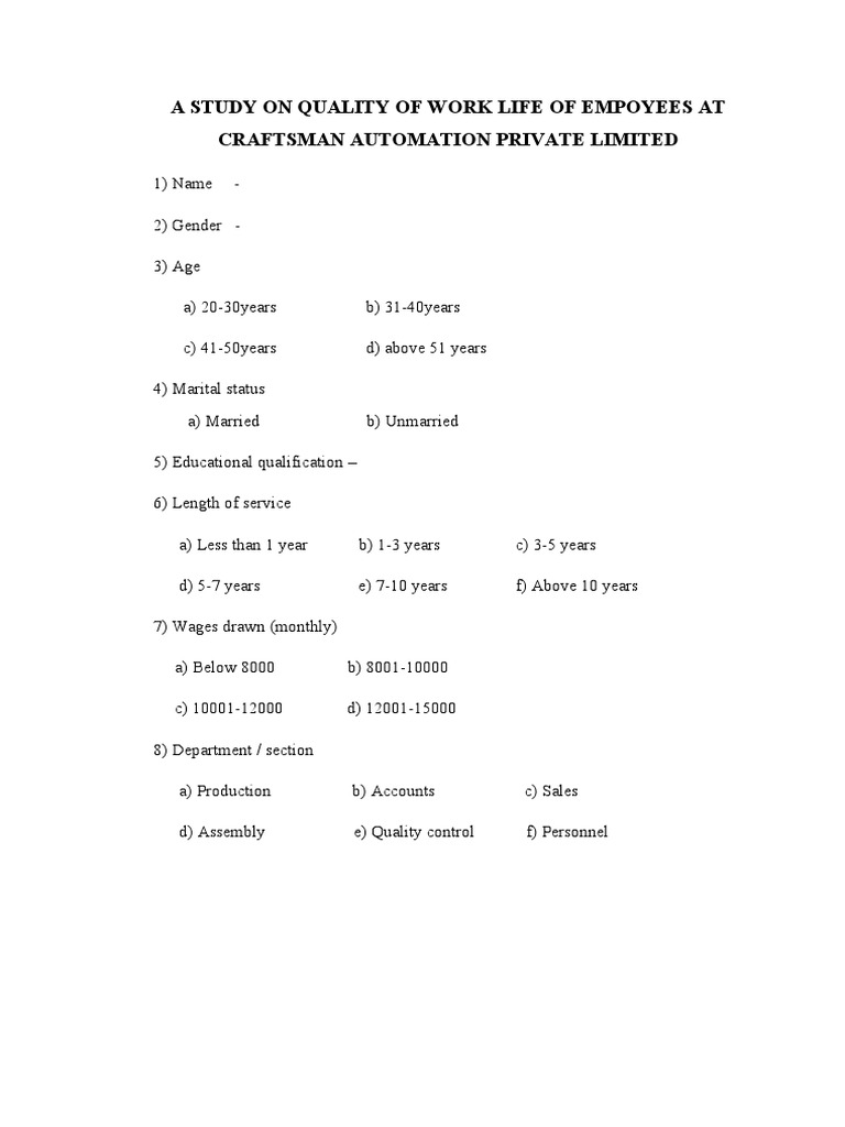 2) Gender 3) Age a) 20-30years c) 41-50years 4) Marital status a) Married 5) ducational !uali"ication # $) %engt& o" service a) %ess t&an 1 year d) 5-' years ') (ages dra)n *mont&ly) a) +elo) ,000 c) 10001-12000 ,) -e.artment / section a) 0roduction d) Assembly b) Accounts e) 2uality control c) 1ales ") 0ersonnel b) ,001-10000 d) 12001-15000 b) 1-3 years e) '-10 years c) 3-5 years ") Above 10 years b) Unmarried b) 31-40years d) above 51 years