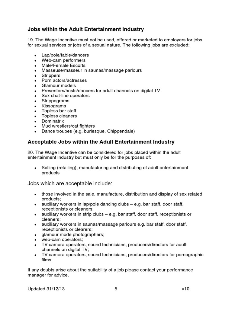 DWP Work Programme Guidance - Wage Incentives for Adult Entertainment Industry Job