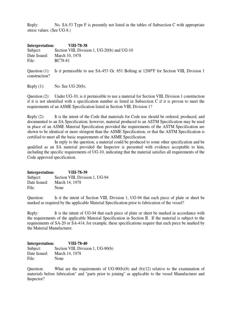 Interpretation: VIII-78-38 Subject: Section VIII, Division 1, UG-20(b) and UG-10 Date Issued: March 10, 1978 File: BC78-81 Question (1): construction? Reply (1): Is it permissible to use SA-453 Gr. 651 Bolting at 1200F for Section VIII, Division 1