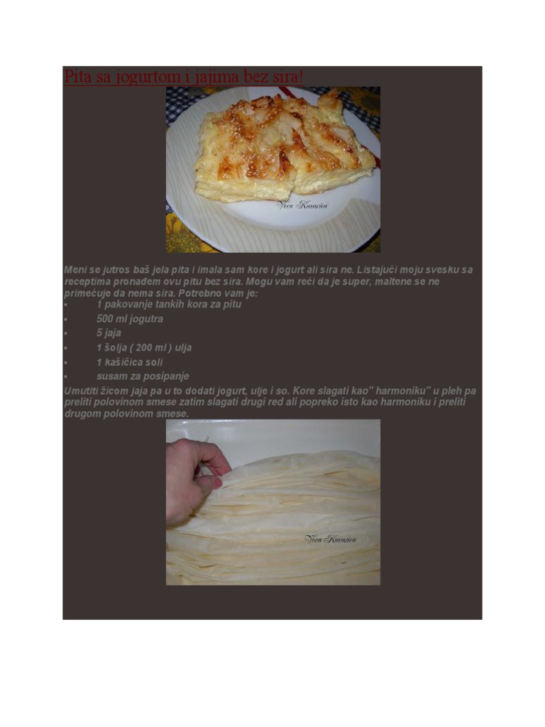 Meni se jutros ba jela pita i imala sam kore i jogurt ali sira ne. Listajui moju svesku sa receptima pronaem ovu pitu bez sira. Mogu vam rei da je super, maltene se ne primeuje da nema sira. Potrebno vam je: 1 pakovanje tankih kora za pitu 500 ml jogutra 5 jaja 1 olja ( 200 ml ) ulja 1 kaiica soli susam za posipanje Umutiti icom jaja pa u to dodati jogurt, ulje i so. Kore slagati kao" harmoniku" u pleh pa preliti polovinom smese zatim slagati drugi red ali popreko isto kao harmoniku i preliti drugom polovinom smese.