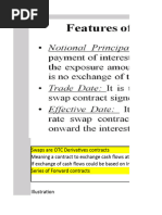 The rate to discount the US$ flows is 2% per period (iUS$ = 4% (APR)) and the rate to discount the A$ flows is 2% per period (iA$ = 4% (APR)). With the spot rate of US$0.80/A$ this technique would yield: PV ($ side at 2% per period) = US$1M/1.02 + US$1M/1.022 + US$1M/1.023 + US$51M/1.024 = US$50M PV(A$ side at 2% per period) = A$2M/1.02 + A$2M/1.022 + A$2M/1.023 + $82M/1.024 = A$81.52M With the exchange rate at US$0.80/A$, the US$ value of the PV of the A$ side of the swap equals = A$81.52 x US$0.80/A$ = US$65.22M Thus under the new conditions, the swap is equivalent to receiving CF with a PV = US$50M and paying CF with a PV = US$65.22M. Thus the swap has a negative value to the firm of US$65.22M - US$50M = US$15.22M (same as other method) General Case: In the case when the interest rates of both currencies (and possibly the exchange rate) change, we must use the discounting method rather than the offsetting swap method. When both interest rates change, it will not be possible to devise a new swap that will completely eliminate the cash flows in one of the two currencies, so we must take the PV of the stream of CF in each currency and convert the present values into a common currency at the current spot rate and compare the present value of the CFs being received with those being paid out to determine whether the swap owner gains or loses. Suppose for our currency swap above, at time 1 the new market conditions are that US$ interest rate for a 2-year swap has fallen to 2% (APR), the A$ interest rate for a 2-year swap has fallen to 4% (APR) and the exchange rate has risen to US$0.75/A$. What would be the market value of the swap at time 1? Here are the remaining cash flows to the original swap: Year CFs to be received Original Swap CFs to be paid 1 1.5 US$1M A$2M 2 US$1M A$2M 2.5 US$1M A$2M 3 US$51M A$82M