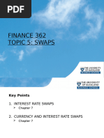 Consider the situation with our currency swap from above. Suppose that at time 1, (just after the interest payments) the A$ interest rate for a 2 year swap has fallen to 4.0% (APR) and the exchange rate has risen to $0.80/A$. The US$ interest rate for a 2 year swap remains at 4.0% (APR) At time 1, we can value the original swap by considering a new 2-year swap constructed with a notional value of $50M designed to eliminate the US$ cash flows on the old swap. This new swap (which we need not enter, but construct only to help us get the net cash flows and value the old swap) will involve receiving US$50M at time 1, and making interest payments of US$50M x 2% = US$1M in each of the remaining 4 semi-annual periods of the original swap and then repaying the $50M principal at time 3. The other side of this new swap will involve paying A$62.5M (the US$ notional value of $50M converted into A$ at the current exchange rate => US$50M/(US$0.8/A$) = A$62.5M) and receiving interest payments of A$1.25M (A$62.5M x 2%) in each of remaining 4 semi-annual periods of the original swap and then receiving the A$62.5M principal at time 3. Thus at time 1 (after the interest payments) the remaining 4 semi-annual cash flows (plus principal payments) to the original swap and the cash flows to the new market swap would be as follows: Year CFs to be received Original Swap CFs to be paid 1 1.5 US$1M A$2M 2 US$1M A$2M 2.5 US$1M A$2M 3 US$51M A$82M