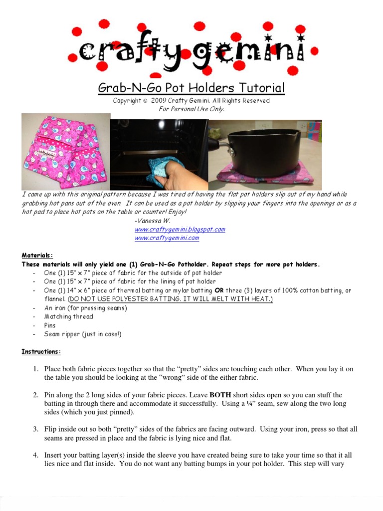 I was tired of having the flat pot holders slip out of my hand while grabbing hot pans out of the oven. It can be used as a pot holder by slipping your fingers into the openings or as a hot pad to place hot pots on the table or counter! Enjoy! -Vanessa W.www.craftygemini.blogspot.com www.craftygemini.com