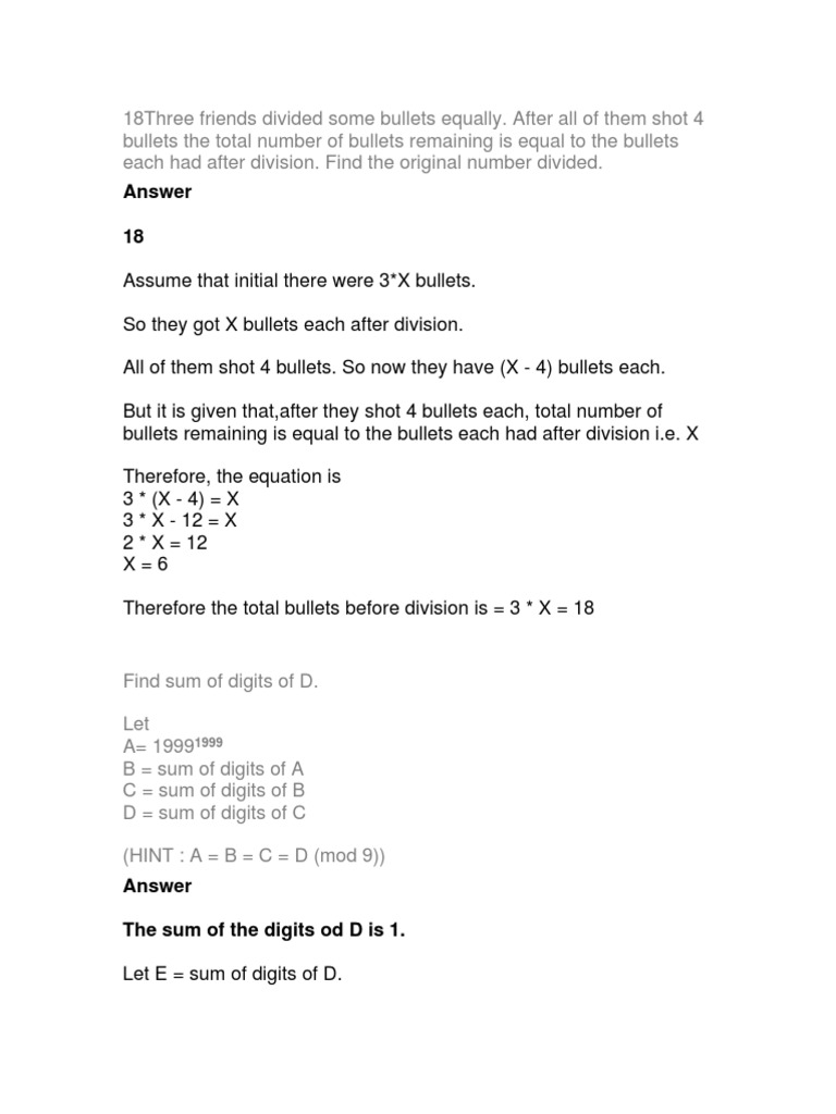 After all of them shot 4 bullets the total number of bullets remaining is equal to the bullets each had after division. Find the original number divided. Answer 18 Assume that initial there were 3*X bullets. So they got X bullets each after division. All of them shot 4 bullets. So now they have (X - 4) bullets each. But it is given that,after they shot 4 bullets each, total number of bullets remaining is equal to the bullets each had after division i.e. X Therefore, the equation is 3 * (X - 4) = X 3 * X - 12 = X 2 * X = 12 X=6 Therefore the total bullets before division is = 3 * X = 18