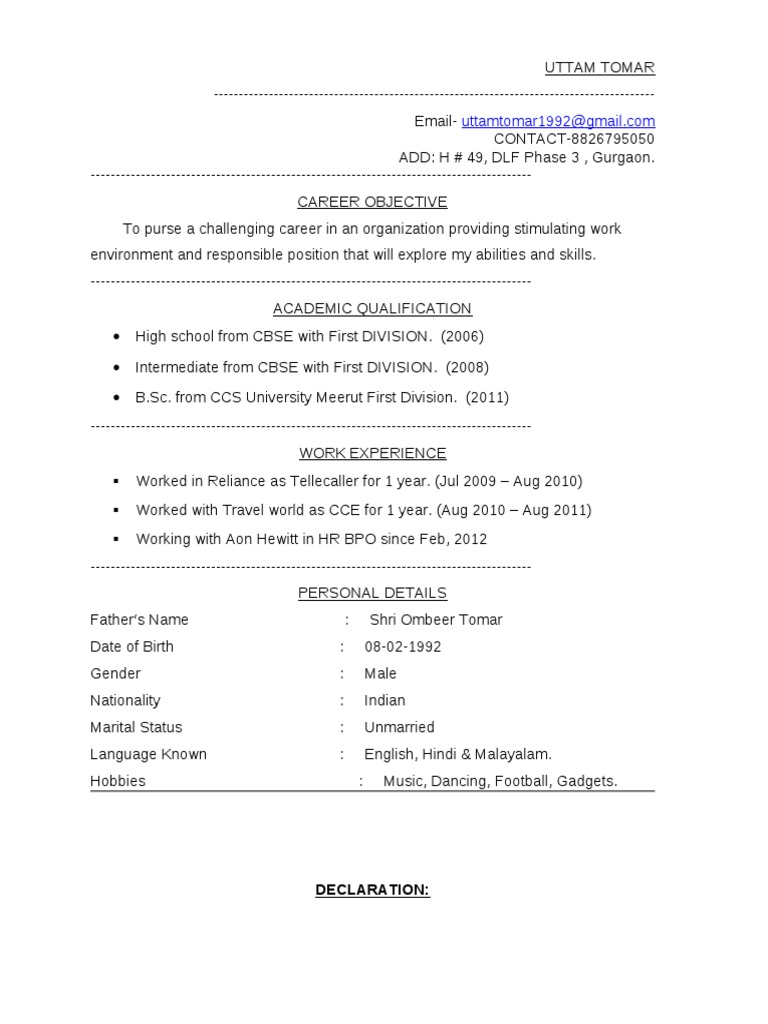 Worked in Reliance as Tellecaller for 1 year. (Jul 2009 Aug 2010)