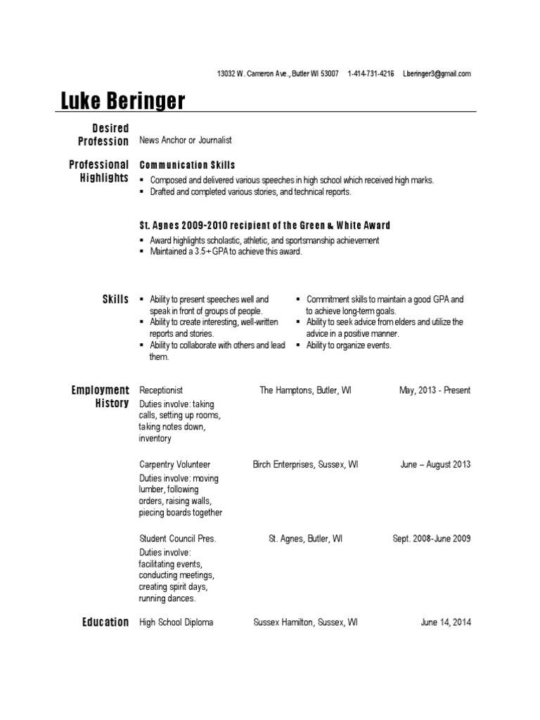News Anchor or Journalist Communication Skills Composed and delivered various speeches in high school which received high marks. Drafted and completed various stories, and technical reports. St. Agnes 2009-2010 recipient of the Green & White Award Award highlights scholastic, athletic, and sportsmanship achievement Maintained a 3.5+ GPA to achieve this award.