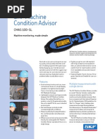 SKF Machine Condition Advisor CMAS 100-SL At the same time, the SKF Machine Condition Advisors non-contact infrared sensor measures the surface temperature of the measurement location and simultaneously displays all three measurement values. Depending on the SKF Machine Condition Advisors System setting, the front-panel LCD simultaneously displays: Metric or Imperial units Velocity in mm/s RMS or in./s derived Peak Temperature in Celsius or Fahrenheit Acceleration enveloping readings in gE Enveloped acceleration: Range: 0,2 to 50,0 gE Frequency: Similar to Band 3 (500 to 10 000 Hz) Temperature: Range: 20 to +200 C (5 to +390 F) Infrared temperature accuracy: 2 C (4 F) Distance: Short range, maximum 10 cm (4 in.) from target Operating temperature range: In use: 10 to +60 C (15 to 140 F) While charging: 0 to 40 C (30 to 105 F) Storage temperature: Less than one month: 20 to +45 C (5 to +115 F) More than one month, but less than six months: 20 to +35 C (5 to +95 F) Humidity: 95% relative humidity, non-condensing Enclosure: IP 54 Approvals: CE Drop test: 2 m (6.6 ft.) Weight: 125 g (4.4 oz.) Dimensions: Length: 200,0 mm (7.90 in.) Width: 47,0 mm (1.85 in.) Height: 25,4 mm (1.00 in.) Battery life: 10 hours before charging again ( 1 000 measurements) With external sensor: Up to 55% less battery life Supported external sensor: Any standard accelerometer with 100 mV/g sensitivity constant current External sensor power: 24 V DC at 3,5 mA Charger specifications: Universal AC/DC wall plug-in Input: 90 to 264 V AC, 47 to 60 Hz Output: 5 V DC regulated 3 to 4 hours for a full charge