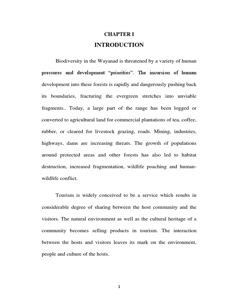 Biodiversity in the Wayanad is threatened by a variety of human pressures and development priorities. The incursion of human development into these forests is rapidly and dangerously pushing back its boundaries, fracturing the evergreen stretches into unviable fragments.. Today, a large part of the range has been logged or converted to agricultural land for commercial plantations of tea, coffee, rubber, or cleared for livestock grazing, roads. Mining, industries, highways, dams are increasing threats. The growth of populations around protected areas and other forests has also led to habitat destruction, increased fragmentation, wildlife poaching and humanwildlife conflict. Tourism is widely conceived to be a service which results in considerable degree of sharing between the host community and the visitors. The natural environment as well as the cultural heritage of a community becomes selling products in tourism. The interaction between the hosts and visitors leaves its mark on the environment, people and culture of the hosts.