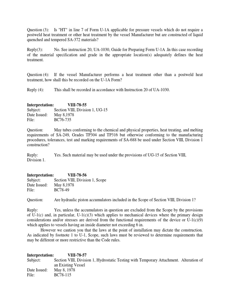 treatment or other heat treatment by the vessel Manufacturer but are constructed of liquid quenched and tempered SA-372 materials? Reply(3): No. See instruction 20, UA-1030, Guide for Preparing Form U-1A .In this case recording of the material specification and grade in the appropriate location(s) adequately defines the heat treatment.