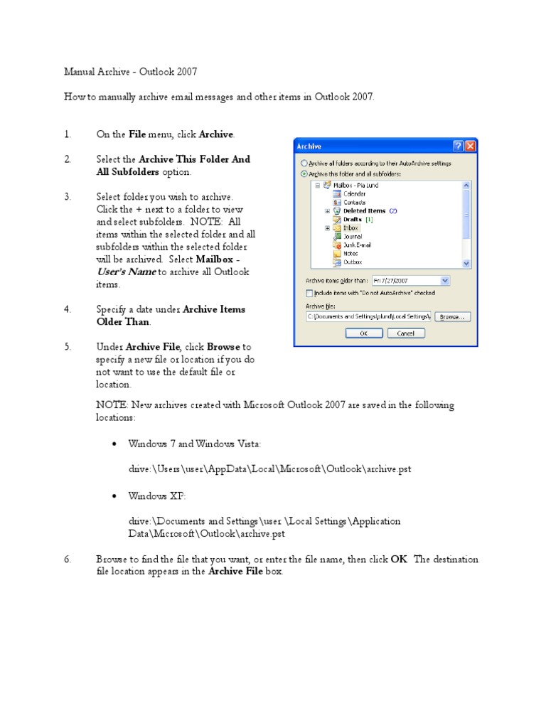 On the File menu, click Archive. Select the Archive This Folder And All Subfolders option. Select folder you wish to archive. Click the + next to a folder to view and select subfolders. NOTE: All items within the selected folder and all subfolders within the selected folder will be archived. Select Mailbox Users Name to archive all Outlook items. Specify a date under Archive Items Older Than. Under Archive File, click Browse to specify a new file or location if you do not want to use the default file or location. NOTE: New archives created with Microsoft Outlook 2007 are saved in the following locations: Windows 7 and Windows Vista: drive:\Users\user\AppData\Local\Microsoft\Outlook\archive.pst Windows XP: drive:\Documents and Settings\user \Local Settings\Application Data\Microsoft\Outlook\archive.pst 6. Browse to find the file that you want, or enter the file name, then click OK. The destination file location appears in the Archive File box.