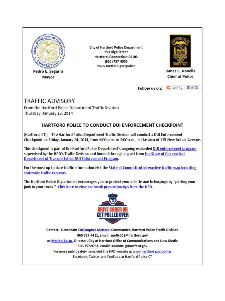 Traffic Advisory: Hartford Police To Conduct Dui Enforcement Checkpoint