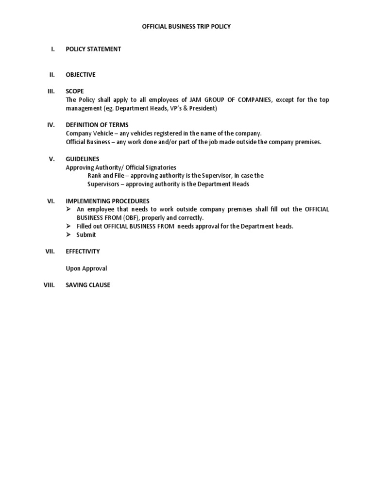OBJECTIVE SCOPE The Policy shall apply to all employees of JAM GROUP OF COMPANIES, except for the top management (eg. Department Heads, VPs & President) DEFINITION OF TERMS Company Vehicle any vehicles registered in the name of the company. Official Business any work done and/or part of the job made outside the company premises. GUIDELINES Approving Authority/ Official Signatories Rank and File approving authority is the Supervisor, in case the Supervisors approving authority is the Department Heads IMPLEMENTING PROCEDURES An employee that needs to work outside company premises shall fill out the OFFICIAL BUSINESS FROM (OBF), properly and correctly. Filled out OFFICIAL BUSINESS FROM needs approval for the Department heads. Submit EFFECTIVITY Upon Approval