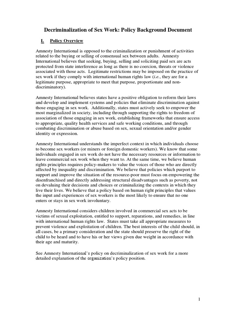 Amnesty International is opposed to the criminalization or punishment of activities related to the buying or selling of consensual sex between adults. Amnesty International believes that seeking, buying, selling and soliciting paid sex are acts protected from state interference as long as there is no coercion, threats or violence associated with those acts. Legitimate restrictions may be imposed on the practice of sex work if they comply with international human rights law (i.e., they are for a legitimate purpose, appropriate to meet that purpose, proportionate and nondiscriminatory). Amnesty International believes states have a positive obligation to reform their laws and develop and implement systems and policies that eliminate discrimination against those engaging in sex work. Additionally, states must actively seek to empower the most marginalized in society, including through supporting the rights to freedom of association of those engaging in sex work, establishing frameworks that ensure access to appropriate, quality health services and safe working conditions, and through combating discrimination or abuse based on sex, sexual orientation and/or gender identity or expression. Amnesty International understands the imperfect context in which individuals choose to become sex workers (or miners or foreign domestic workers). We know that some individuals engaged in sex work do not have the necessary resources or information to leave commercial sex work when they want to. At the same time, we believe human rights principles requires policy-makers to value the voices of those who are directly affected by inequality and discrimination. We believe that policies which purport to support and improve the situation of the resource-poor must focus on empowering the disenfranchised and directly addressing structural disadvantages such as poverty, not on devaluing their decisions and choices or criminalizing the contexts in which they live their lives. We believe that a policy based on human right principles that values the input and experiences of sex workers is the most likely to ensure that no one enters or stays in sex work involuntary. Amnesty International considers children involved in commercial sex acts to be victims of sexual exploitation, entitled to support, reparations, and remedies, in line with international human rights law. States must take all appropriate measures to prevent violence and exploitation of children. The best interests of the child should, in all cases, be a primary consideration and the state should preserve the right of the child to be heard and to have his or her views given due weight in accordance with their age and maturity. See Amnesty Internationals policy on decriminalization of sex work for a more detailed explanation of the organizations policy position.