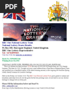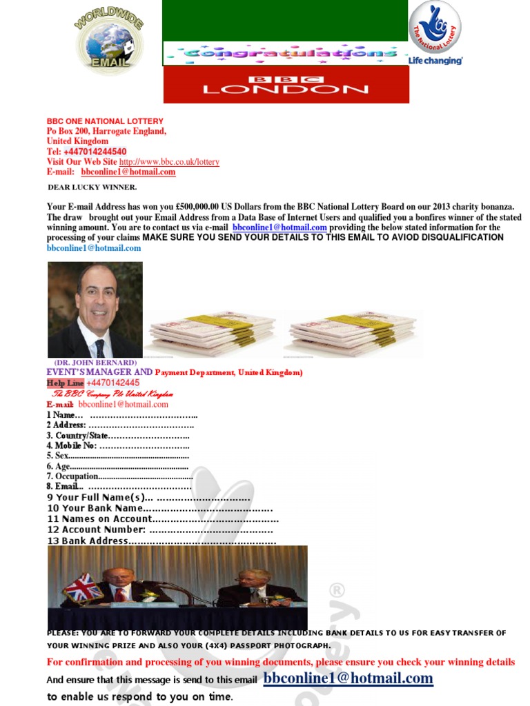 Your E-mail Address has won you 500,000.00 US Dollars from the BBC National Lottery Board on our 2013 charity bonanza. The draw brought out your Email Address from a Data Base of Internet Users and qualified you a bonfires winner of the stated winning amount. You are to contact us via e-mail bbconline1@[Link] providing the below stated information for the processing of your claims MAKE SURE YOU SEND YOUR DETAILS TO THIS EMAIL TO AVIOD DISQUALIFICATION bbconline1@[Link]