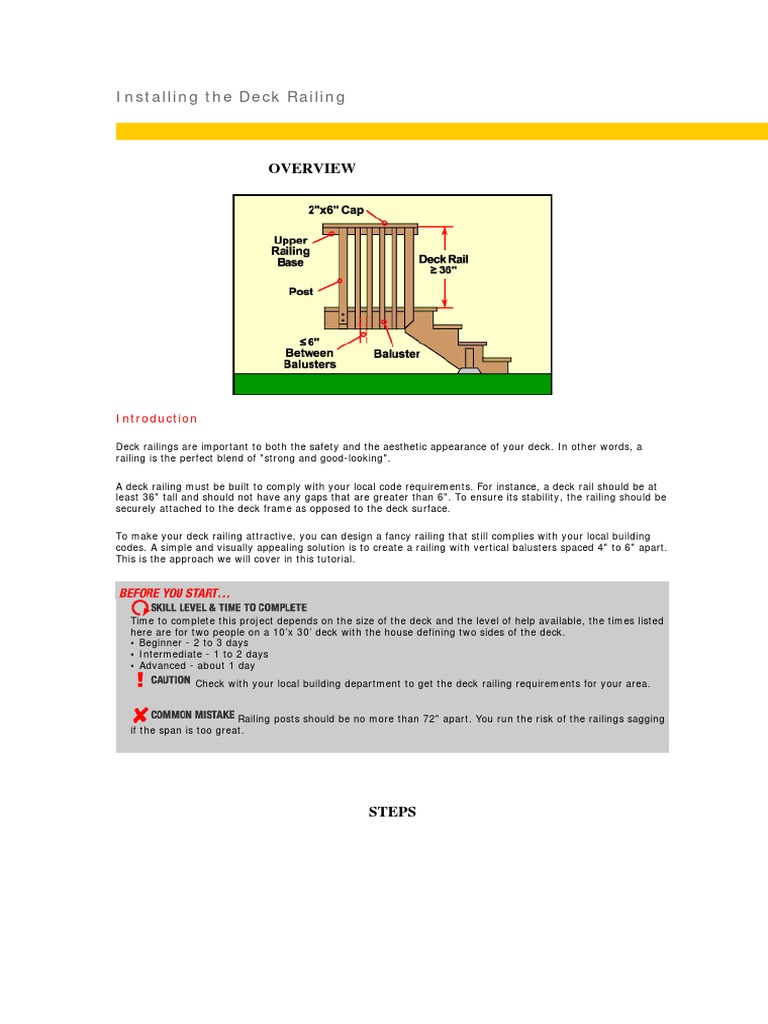 Deck railings are important to both the safety and the aesthetic appearance of your deck. In other words, a railing is the perfect blend of "strong and good-looking". A deck railing must be built to comply with your local code requirements. For instance, a deck rail should be at least 36" tall and should not have any gaps that are greater than 6". To ensure its stability, the railing should be securely attached to the deck frame as opposed to the deck surface. To make your deck railing attractive, you can design a fancy railing that still complies with your local building codes. A simple and visually appealing solution is to create a railing with vertical balusters spaced 4" to 6" apart. This is the approach we will cover in this tutorial.
