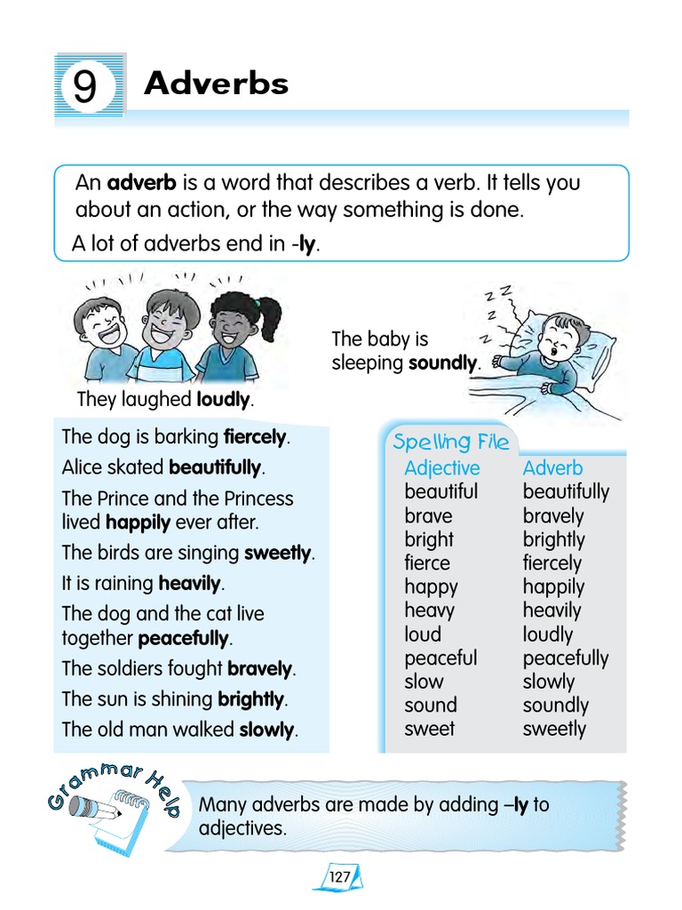 An adverb is a word that describes a verb. It tells you about an action, or the way something is done. A lot of adverbs end in -ly.