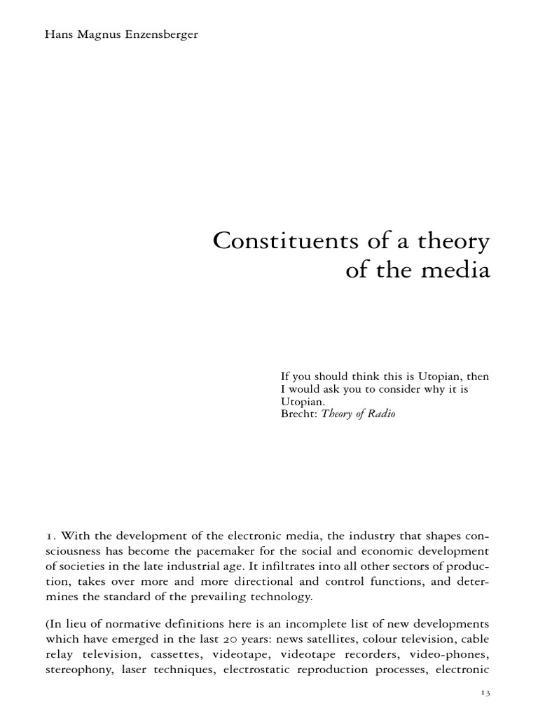 is not enough. Danger of under-estimating the growing conflicts in the media field, of neutralizingthem, of interpreting them merely in terms of trade unionism orliberalism, on the lines of traditional labour struggles or as the clash of special interests (programme heads—executive producers, publishers—authors, monopolies—medium sized businesses, public corporations—private companies, etc.). An appreciation of this kind does not go farenough and remains bogged down in tactical arguments.)So far there is no Marxist theory of the media. There is therefore nostrategy one can apply in this area. Uncertainty, alternations betweenfear and surrender, mark the attitude of the socialist Left to the newproductive forces of the media industry. The ambivalence of thisattitude merely mirrors the ambivalence of the media themselveswithout mastering it. It could only be overcome by releasing theemancipatory potential which is inherent in the new productiveforces—a potential which capitalism must sabotage just as surely asSoviet revisionism, because it would endanger the rule of both systems.