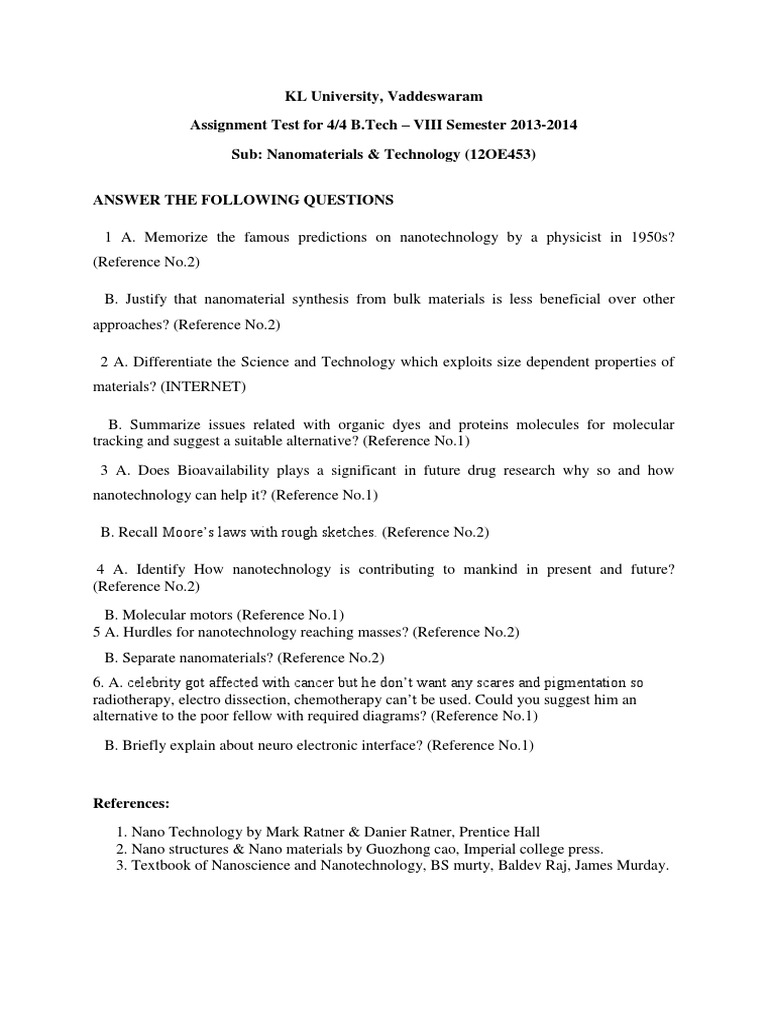 Tech VIII Semester 2013-2014 Sub: Nanomaterials & Technology (12OE453) ANSWER THE FOLLOWING QUESTIONS 1 A. Memorize the famous predictions on nanotechnology by a physicist in 1950s? (Reference No.2) B. Justify that nanomaterial synthesis from bulk materials is less beneficial over other approaches? (Reference No.2) 2 A. Differentiate the Science and Technology which exploits size dependent properties of materials? (INTERNET) B. Summarize issues related with organic dyes and proteins molecules for molecular tracking and suggest a suitable alternative? (Reference No.1) 3 A. Does Bioavailability plays a significant in future drug research why so and how nanotechnology can help it? (Reference No.1) B. Recall Moores laws with rough sketches. (Reference No.2) 4 A. Identify How nanotechnology is contributing to mankind in present and future? (Reference No.2) B. Molecular motors (Reference No.1) 5 A. Hurdles for nanotechnology reaching masses? (Reference No.2) B. Separate nanomaterials? (Reference No.2) 6. A. celebrity got affected with cancer but he dont want any scares and pigmentation so radiotherapy, electro dissection, chemotherapy cant be used. Could you suggest him an alternative to the poor fellow with required diagrams? (Reference No.1) B. Briefly explain about neuro electronic interface? (Reference No.1)
