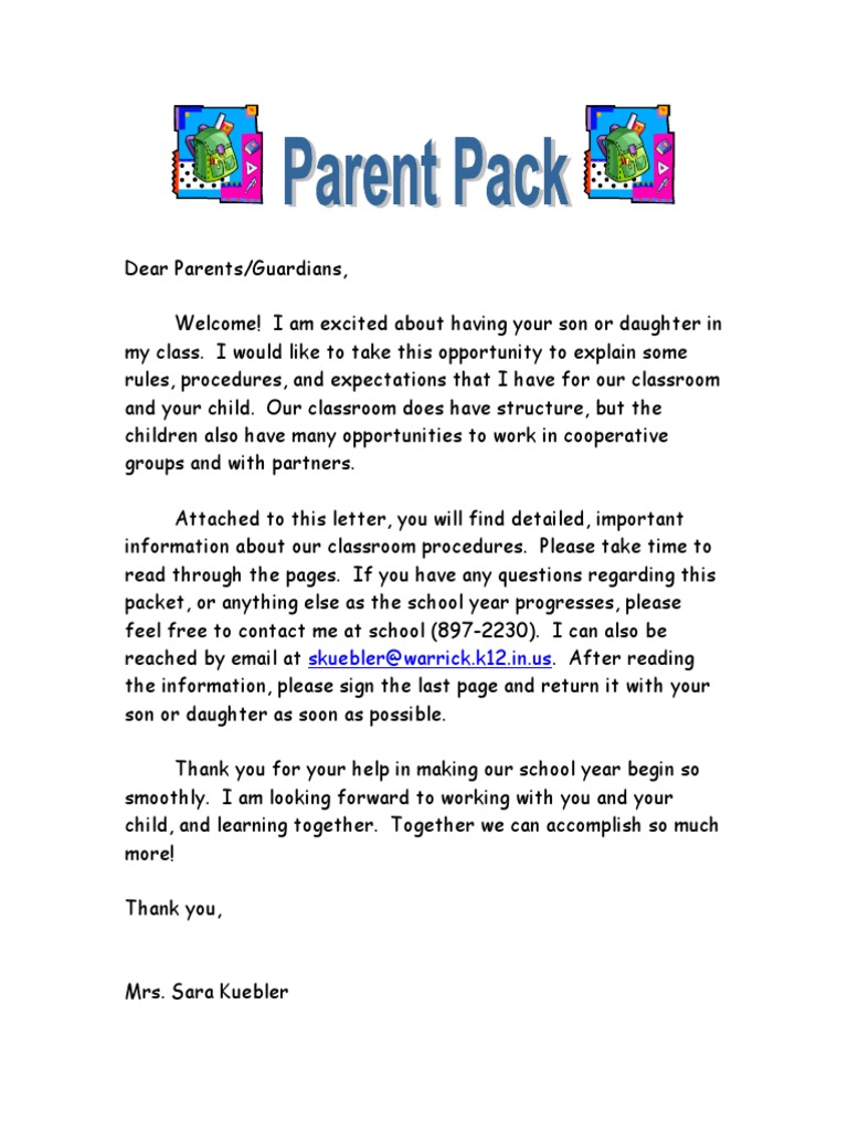 I would like to take this o ortunity to ex lain some rules, rocedures, and ex ectations that I have !or our classroom and your child. "ur classroom does have structure, but the children also have many o ortunities to work in coo erative grou s and with artners. #ttached to this letter, you will !ind detailed, im ortant in!ormation about our classroom rocedures. Please take time to read through the ages. I! you have any $uestions regarding this acket, or anything else as the school year rogresses, lease !eel !ree to contact me at school %&'()**+,-. I can also be reached by email at skuebler.warrick.k/*.in.us. #!ter reading the in!ormation, lease sign the last age and return it with your son or daughter as soon as ossible. 0hank you !or your hel in making our school year begin so smoothly. I am looking !orward to working with you and your child, and learning together. 0ogether we can accom lish so much more! 0hank you,