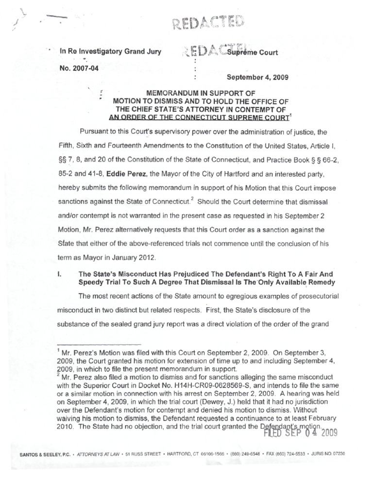 Mayor of Hartford, ct., seeks sanctions against The State of Connecticut. He says the most recent actions of The State amount to egregious examples of prosecutorial misconduct. The State's disclosure of the substance of the sealed grand jury report was a direct violation of the order of the grand jury, he says.